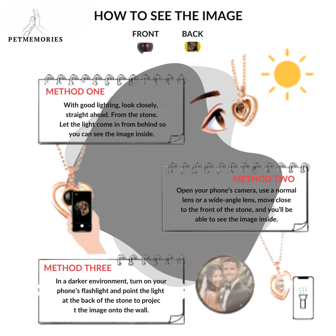 The central ball of the neckace projects your pet´s image through micro-projection.You can see it by looking through the ball or by shining a flashlight (like your phone´s) onto a dark surface